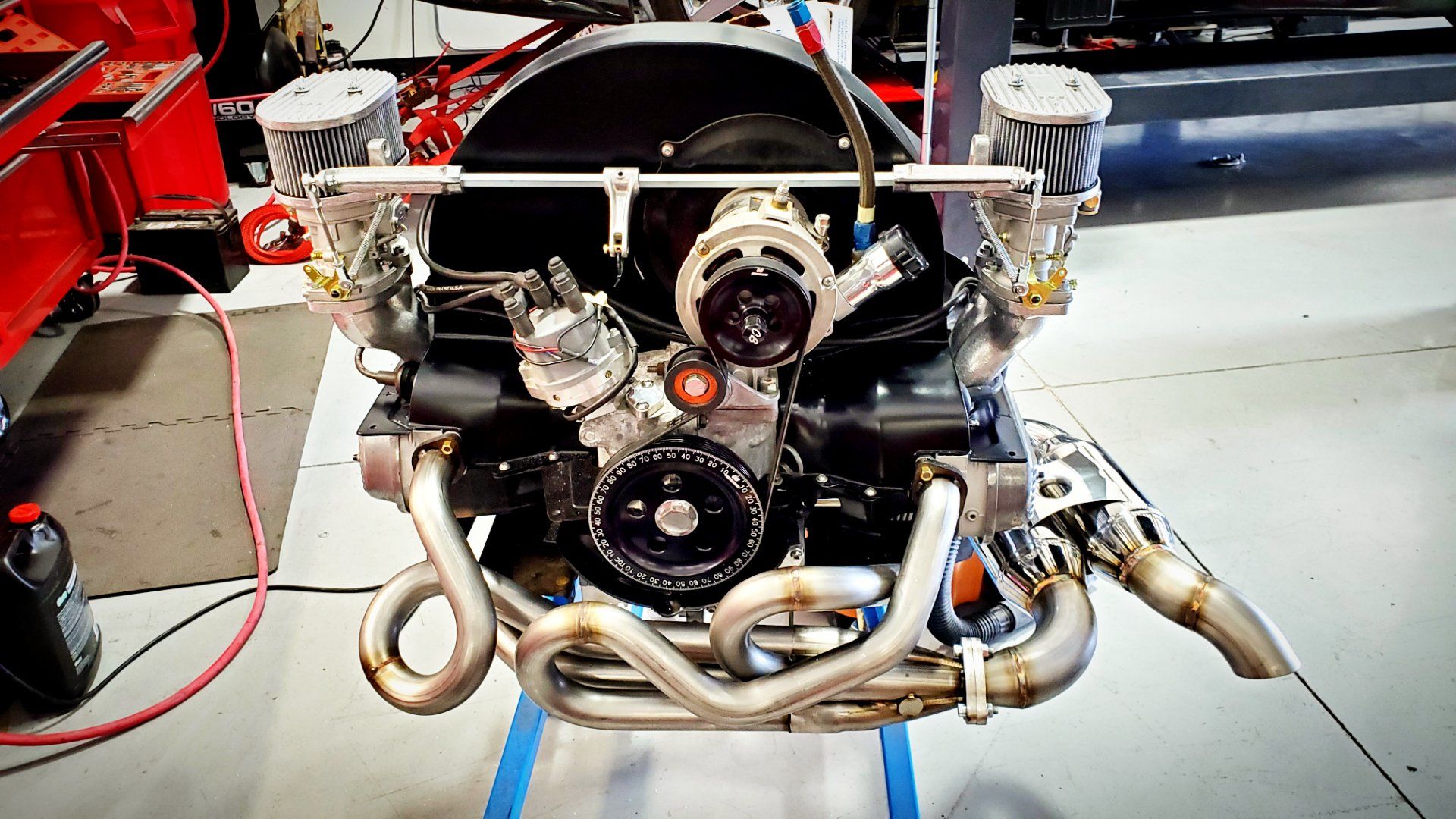 Jon's 1904cc rebuild with new cooling tins, dual Weber 40 IDF carbs, A-1 sidewinder exhaust, etc. Fun street power!